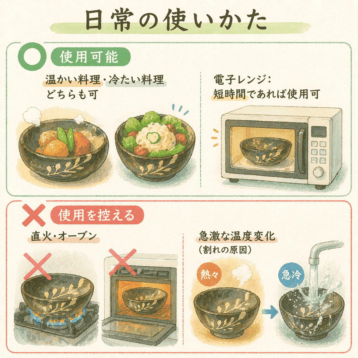 - 陶器の特性上、水分や油分をわずかに吸収します