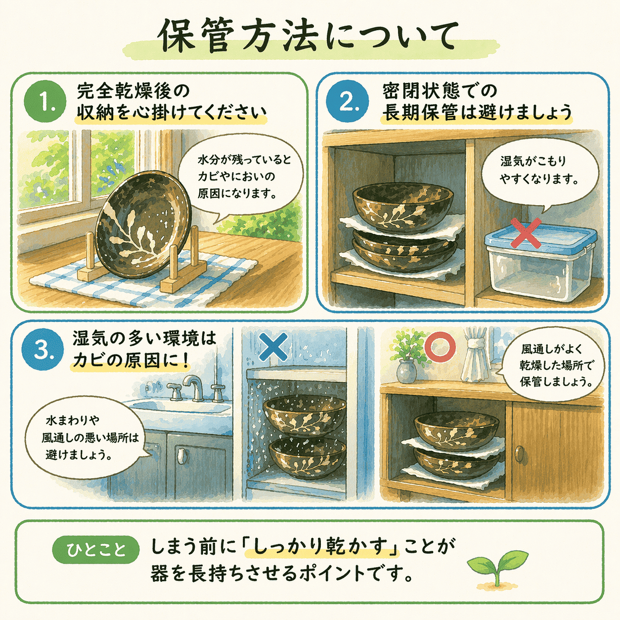 ・完全乾燥後の収納を心掛けてください